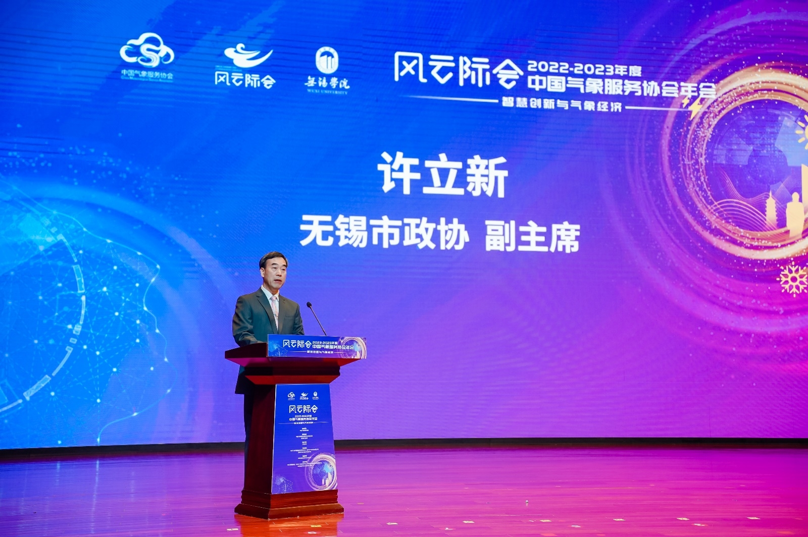 人民政协网无锡4月27日电(记者李京)4月25日至27日,“风云际会·中国气象服务协会2022-2023年会”在江苏无锡学院召开。本届年会以“智慧创新与气象经济”为主题,共同探讨最前端技术与气象科技创新发展,洞悉气象产业的发展趋势。国家减灾委员会秘书长郑国光、中国气象服务协会会长许小峰、中国气象局原副局长矫梅燕、中国气象局原副局长于新文、江苏省无锡市政协副主席许立新、江苏省气象局党组书记翟武全、无锡学院校长张永宏等领导出席会议,中国气象局相关职能部门及直属事业单位领导、相关省(市)气象局领导,气象、人工智能、防灾减灾、金融保险等相关领域知名专家学者,科技奖获奖单位、高校科研院所、会员企业代表等600余人齐聚一堂,共同打造这场高水平气象产业盛宴。