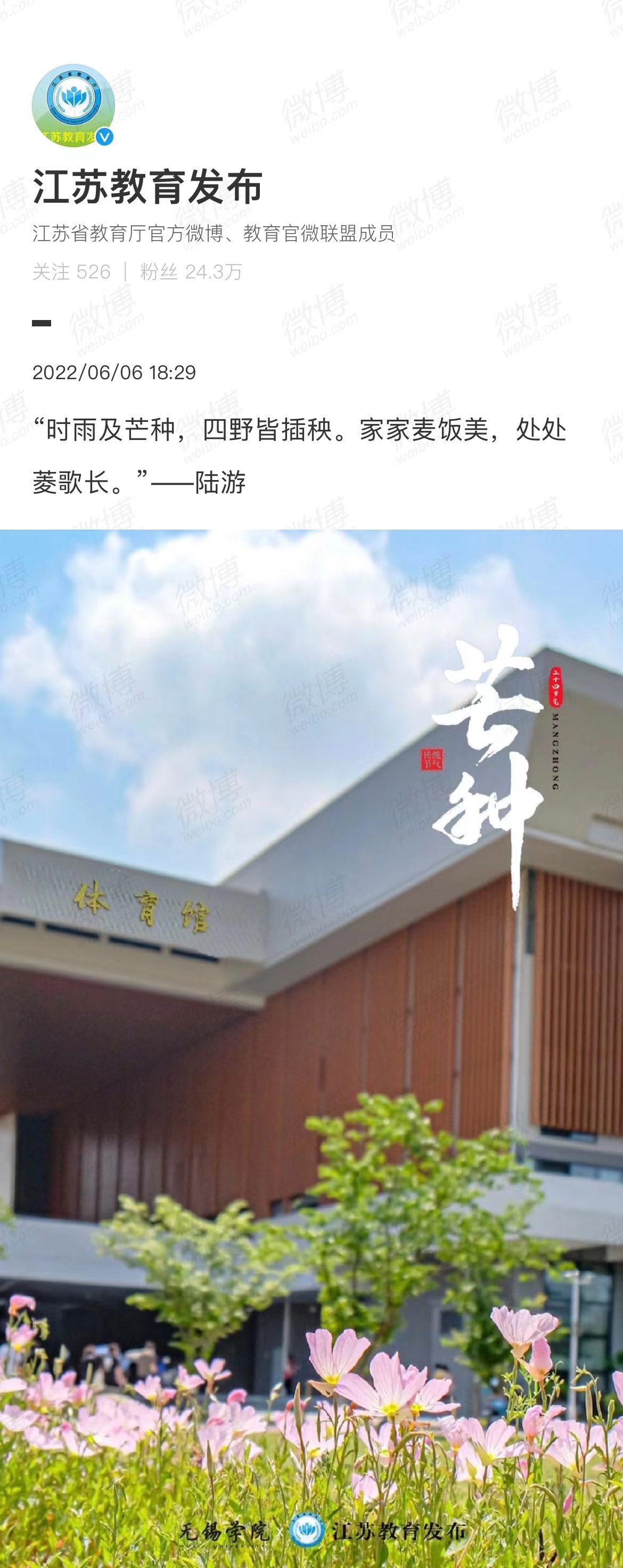 媒体视角 当前位置: 首页 >> 媒体视角 >> 正文 【江苏教育发布官博】芒种节气 发布日期:2022-06-07 点击: 链接地址:https://m.weibo.cn/status/4777429409206667?wm=3333_2001&from=10C5393010&sourcetype=weixin 上一篇:【江苏省教育厅官网】无锡学院大力加强思政课建设 下一篇:【江苏教育发布官微】无锡学院举办滨湖区上市公司专场招聘会