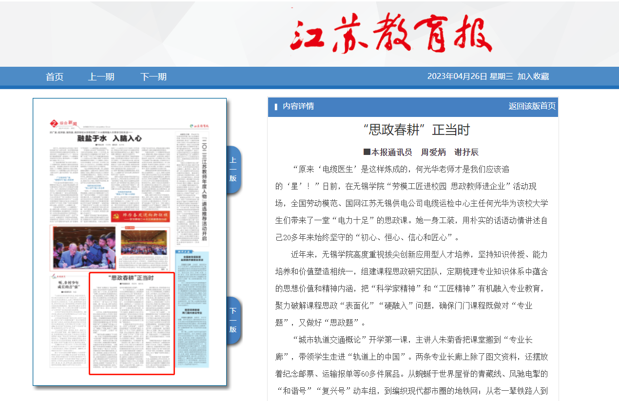 与课程思政同向同行的还有一堂堂“大思政课”。无锡学院统筹推进“大思政课”建设,注重在“大”字上下功夫,集纳社会资源、突出实践导向,建设“大课堂”,拓展“大平台”,打造“大师资”,构建系统化、协同化、多元化大思政育人格局。该校党委书记杨建新表示,“大思政课”是一项系统工程,要打开校门,延伸育人半径,到社会大课堂里寻找鲜活的思政素材,在百年大党的精神谱系和中国式现代化的时代变革中提炼思政“关键词”。