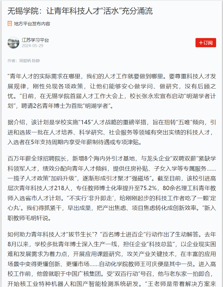 “‘青年科技人才含量’是发展新质生产力的‘关键增量’。”无锡学院党委书记杨建新表示,将持续深化人才发展体制机制改革,加强政治关怀、工作关心、生活关爱,办好他们的“人生大事”和“关键小事”,营造“养人”生态,让青年科技人才“活水”充分涌流,为高水平应用型大学建设夯实“人才底座”。