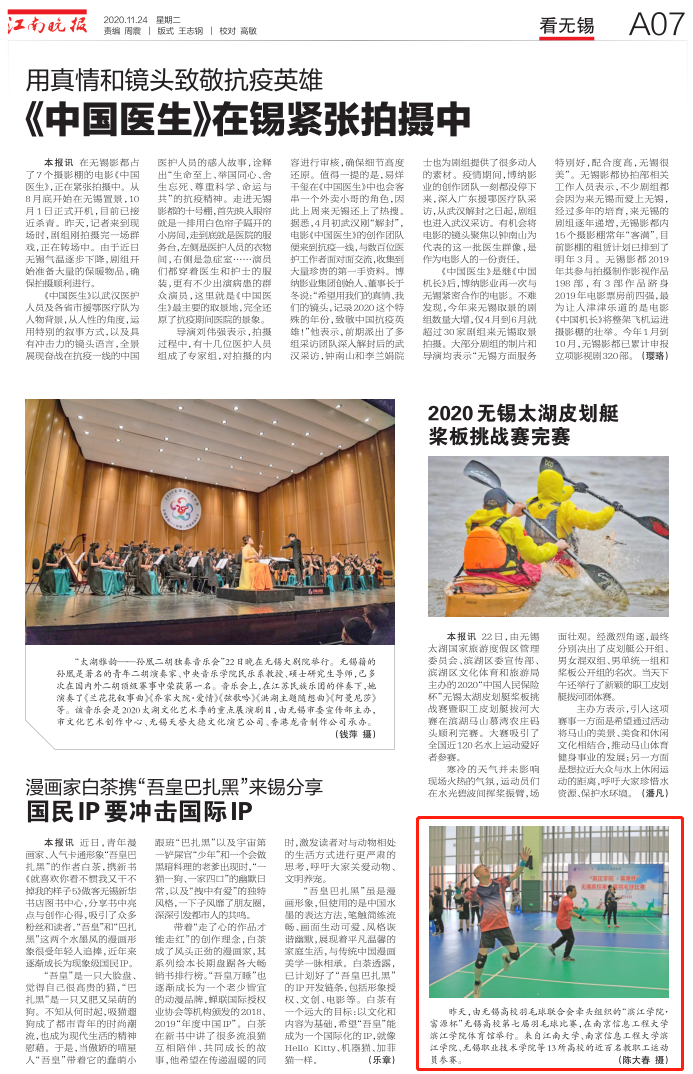 媒体视角 当前位置: 首页 >> 媒体视角 >> 正文 江南晚报:无锡高校第七届羽毛球比赛在南京信息工程大学滨江学院体育馆举行 发布日期:2020-11-24 点击: 11月21日,由无锡高校羽毛球联合会牵头组织的“滨江学院·富源杯”无锡高校第七届羽毛球比赛,在南京信息工程大学滨江学院体育馆举行。来自江南大学、南京信息工程大学滨江学院、无锡职业技术学院等13所高校的近百名教职工运动员参赛。(陈大春 摄) 报道链接:http://szb.wxrb.com/jnwb/pc/content/202011/24/content_63511.html 上一篇:无锡日报:城市最强大脑智享未来 下一篇:无锡日报:安全感满满 惊喜连连 南信大滨江学院2700名新生入校