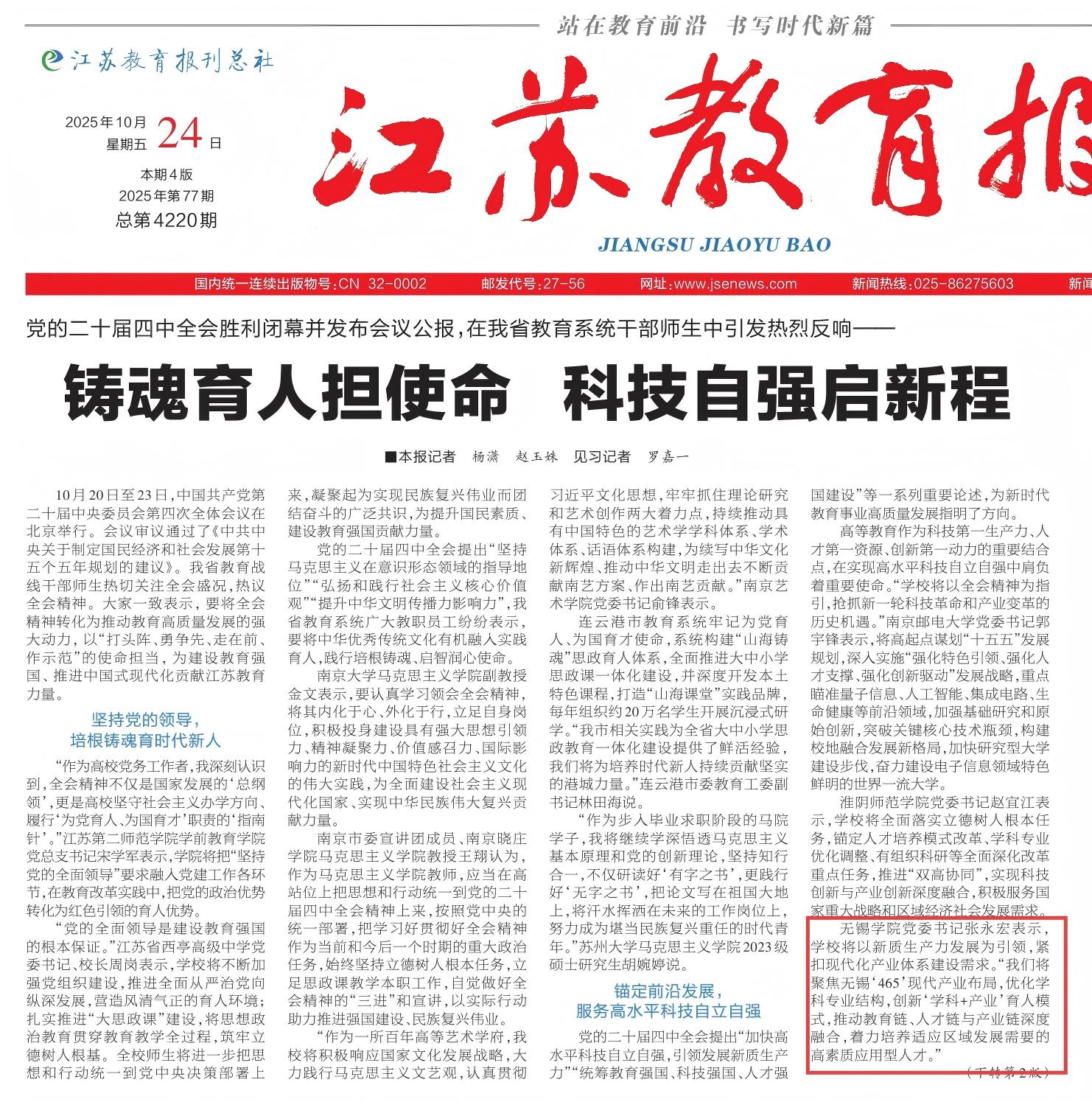 无锡学院党委书记张永宏表示,学校将以新质生产力发展为引领,紧扣现代化产业体系建设需求。“我们将聚焦无锡‘465’现代产业布局,优化学科专业结构,创新‘学科+产业’育人模式,推动教育链、人才链与产业链深度融合,着力培养适应区域发展需要的高素质应用型人才。”