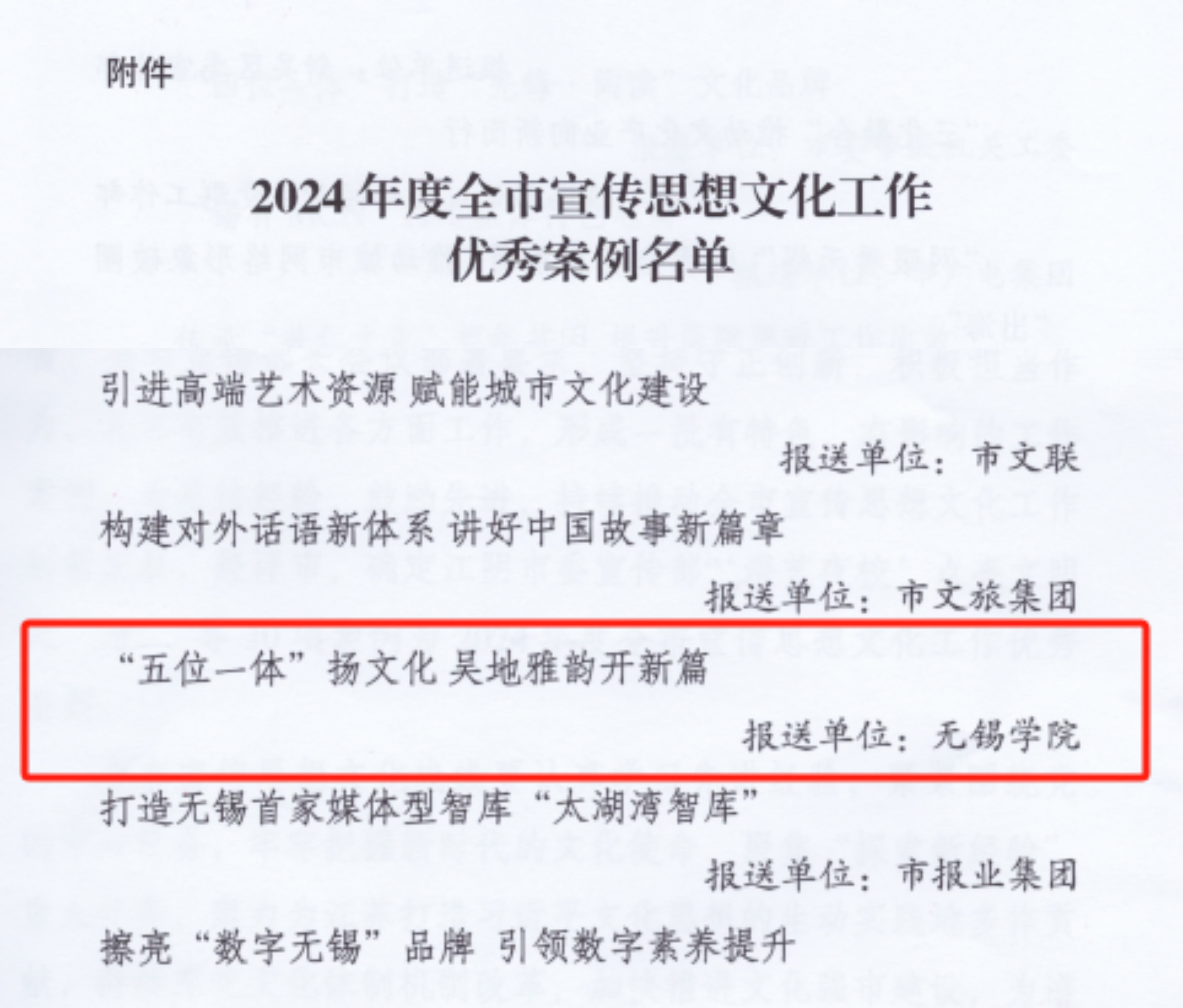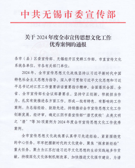 近日,中共无锡市委宣传部印发《关于2024年度全市宣传思想文化工作优秀创新案例的通报》,我校报送的《“五位一体”扬文化 吴地雅韵开新篇》从众多案例中脱颖而出,成功入选。此次评选共表彰30项优秀案例,我校为在锡高校中唯一获此殊荣的单位。