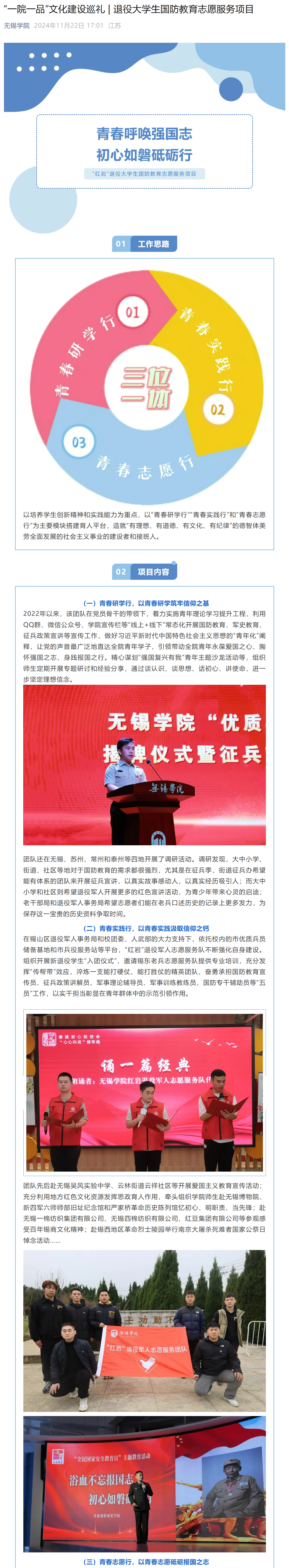 当前位置: 首页 >> 校园文化 >> 正文 “一院一品”文化建设巡礼 | 退役大学生国防教育志愿服务项目 发布日期:2024-11-22 点击: 上一篇:“一院一品”文化建设巡礼|“五位一体”下志愿服务工作体系的探索与构建 下一篇:“一院一品”文化建设巡礼 | “护航青春,与法同行”法治文化宣传系列主题活动